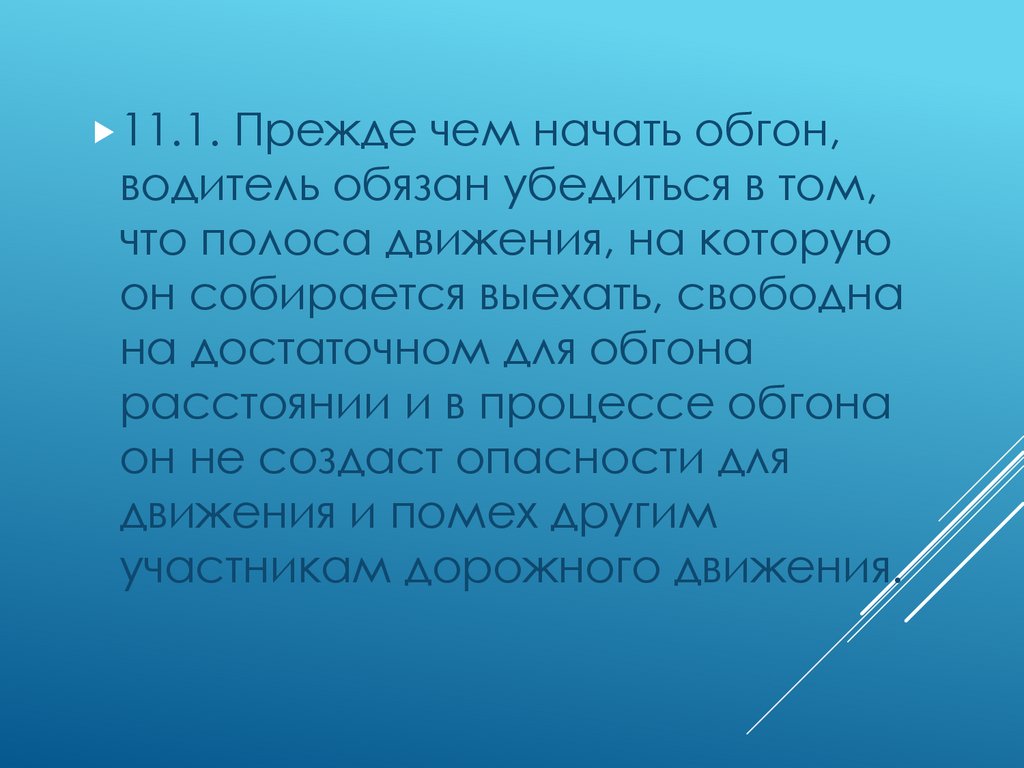11.1. Прежде чем начать обгон,водитель обязан убедиться в том,