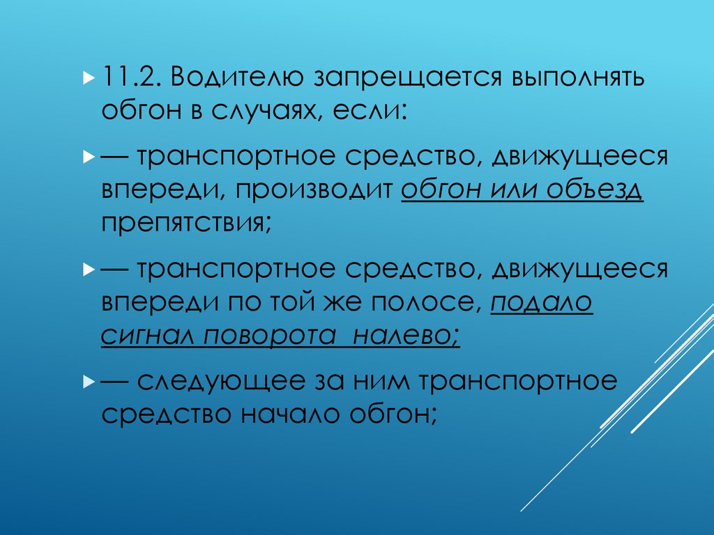 11.2. Водителю запрещается выполнятьобгон в случаях, если: