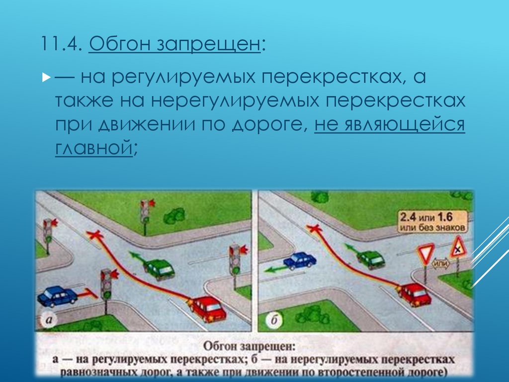 11.4. Обгон запрещен:— на регулируемых перекрестках, а
