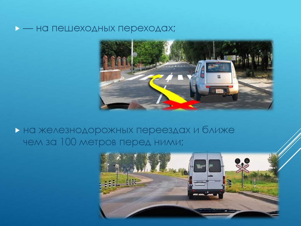 — на пешеходных переходах;на железнодорожных переездах и ближе