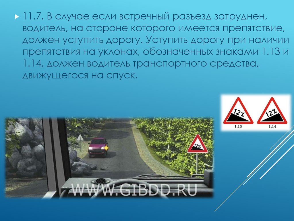 11.7. В случае если встречный разъезд затруднен,водитель, на стороне которого имеется препятствие,