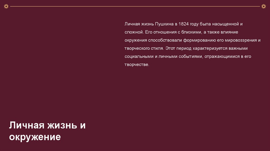 Личная жизнь Пушкина в 1824 году была насыщенной исложной. Его отношения с близкими, а также влияние