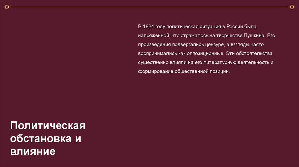 В 1824 году политическая ситуация в России быланапряженной, что отражалось на творчестве Пушкина. Его