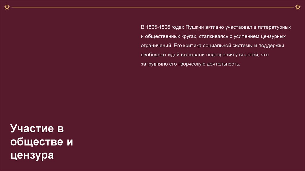 В 1825-1826 годах Пушкин активно участвовал в литературныхи общественных кругах, сталкиваясь с усилением цензурных