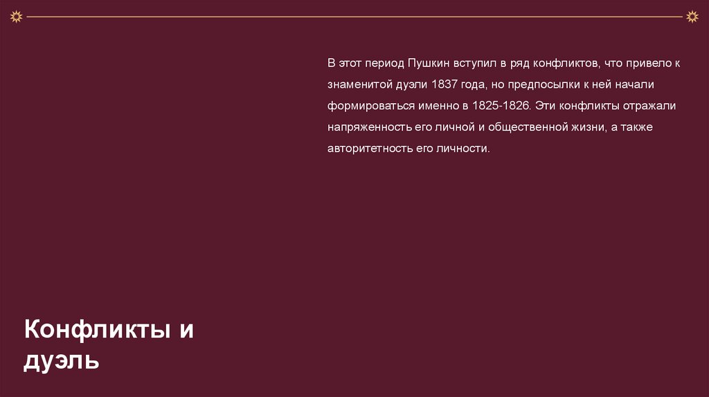 В этот период Пушкин вступил в ряд конфликтов, что привело кзнаменитой дуэли 1837 года, но предпосылки к ней начали
