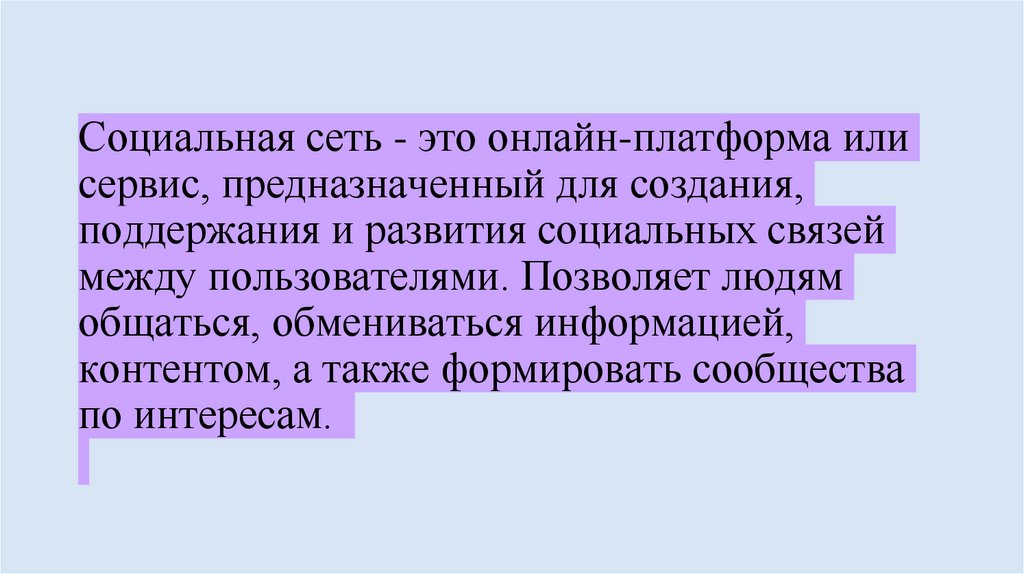 Социальная сеть - это онлайн-платформа илисервис, предназначенный для создания,