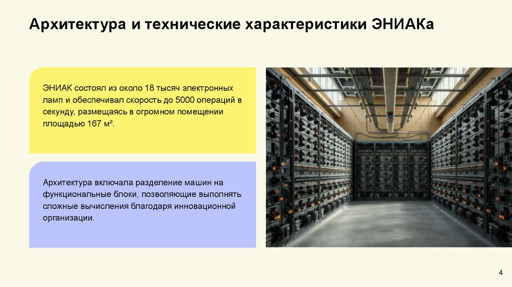 Архитектура и технические характеристики ЭНИАКаЭНИАК состоял из около 18 тысяч электронных