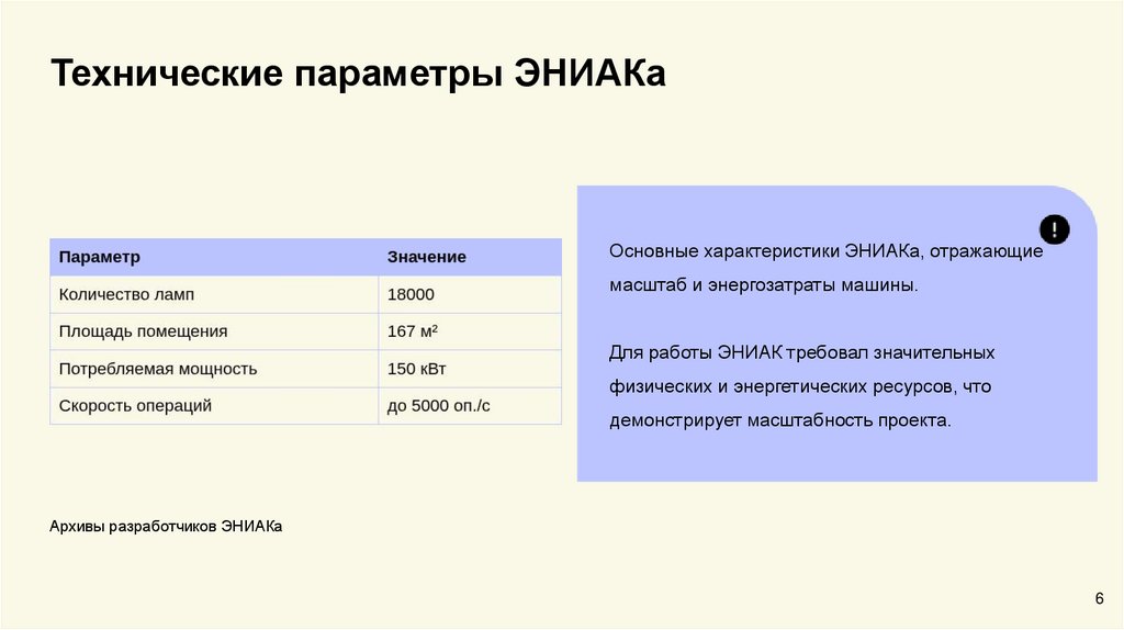 Технические параметры ЭНИАКаОсновные характеристики ЭНИАКа, отражающие