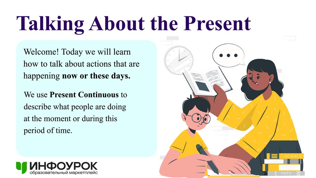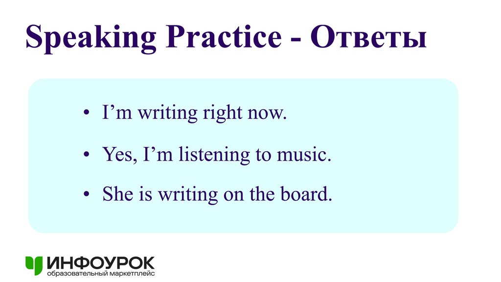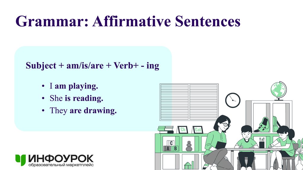 Grammar: Affirmative SentencesSubject + am/is/are + Verb+ - ing
