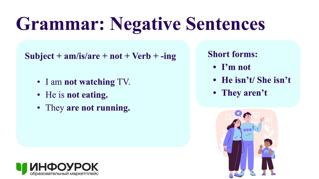 Grammar: Negative SentencesSubject + am/is/are + not + Verb + -ing