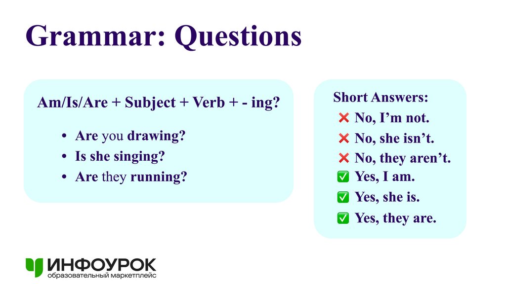 Grammar: QuestionsAm/Is/Are + Subject + Verb + - ing?
