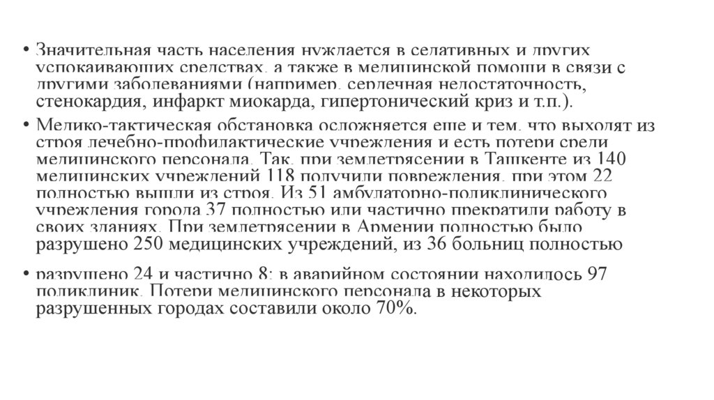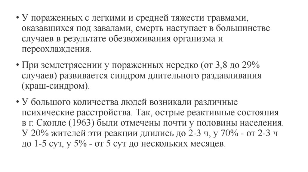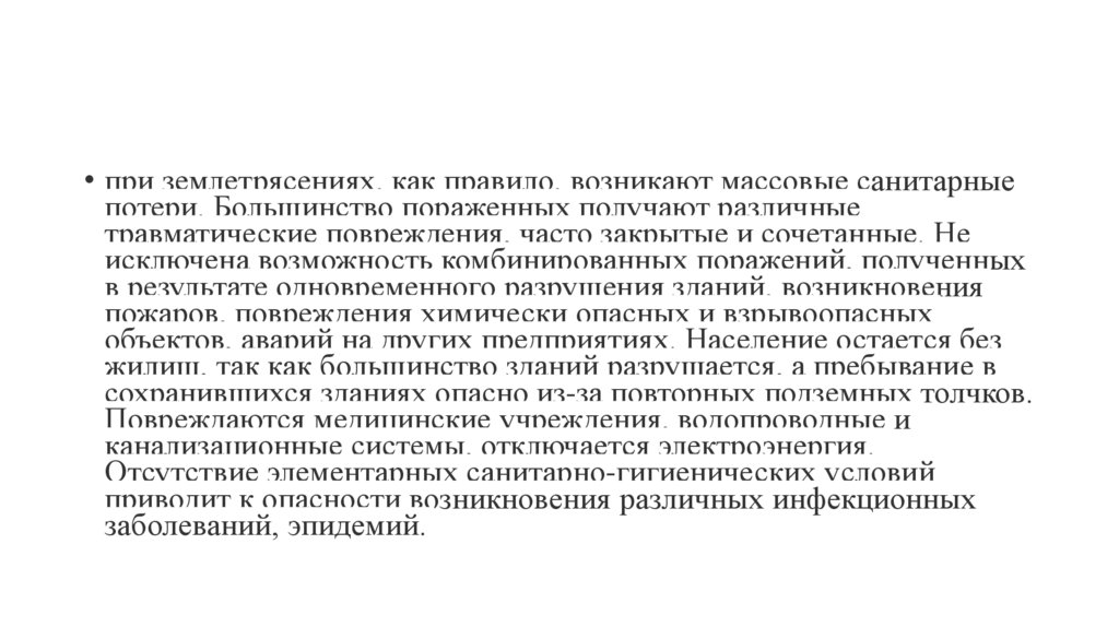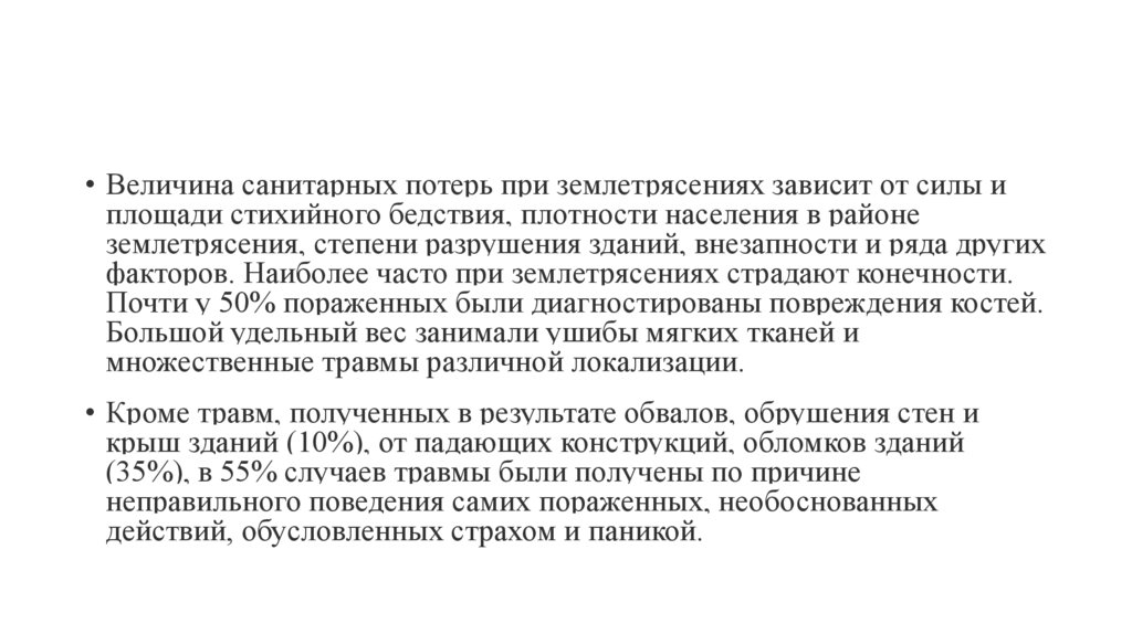 • при землетрясениях, как правило, возникают массовые санитарныепотери. Большинство пораженных получают различные