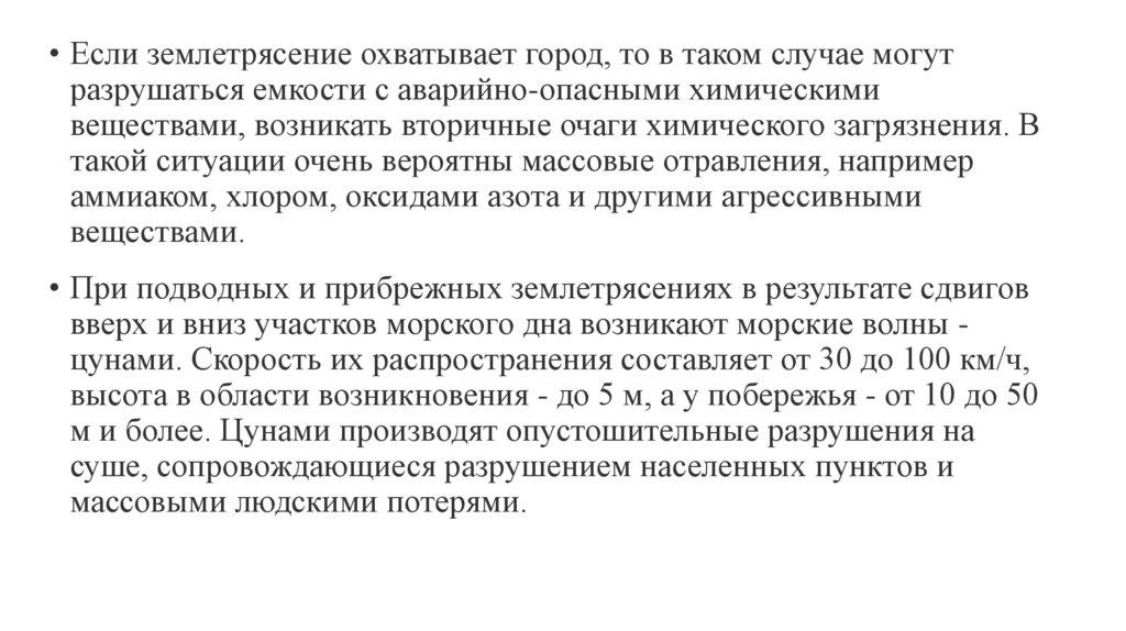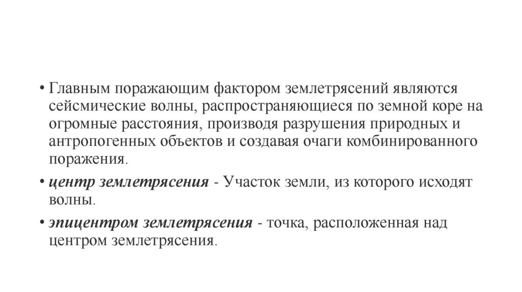 • Главным поражающим фактором землетрясений являютсясейсмические волны, распространяющиеся по земной коре на