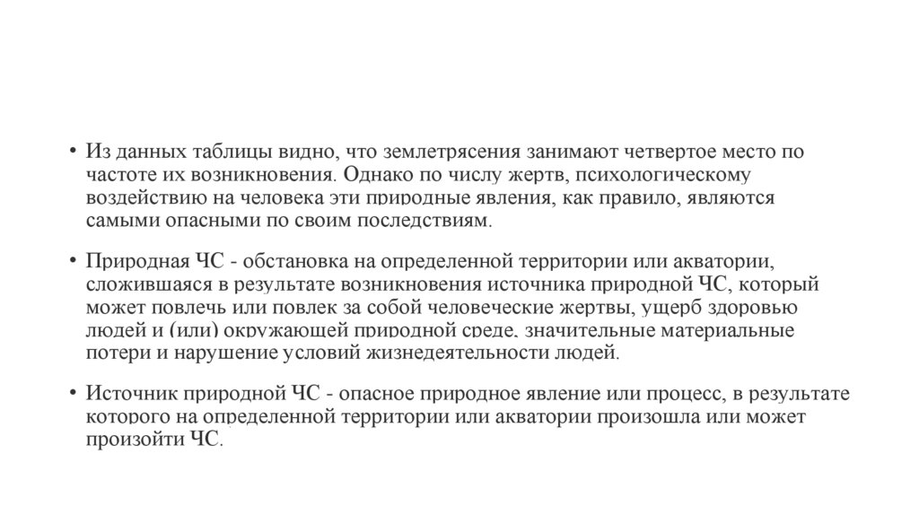 • Из данных таблицы видно, что землетрясения занимают четвертое место почастоте их возникновения. Однако по числу жертв, психологическому