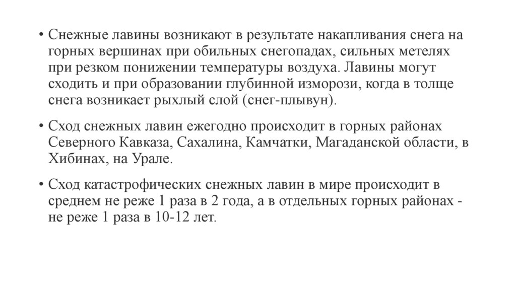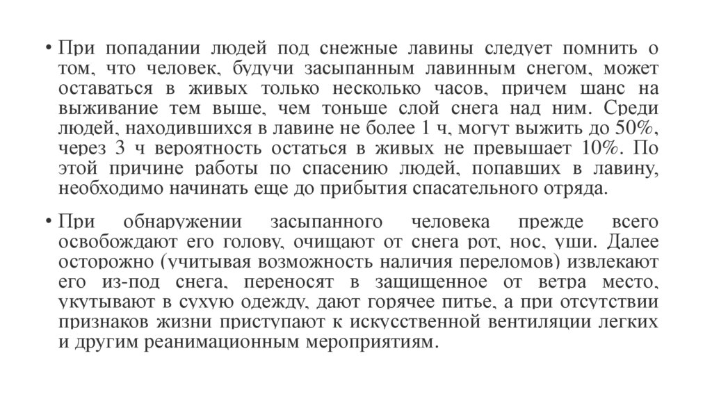 • При попадании людей под снежные лавины следует помнить отом, что человек, будучи засыпанным лавинным снегом, может