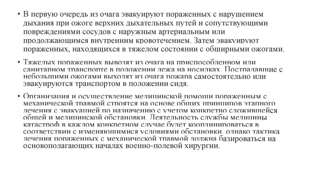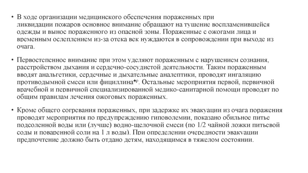 • В ходе организации медицинского обеспечения пораженных приликвидации пожаров основное внимание обращают на тушение воспламенившейся