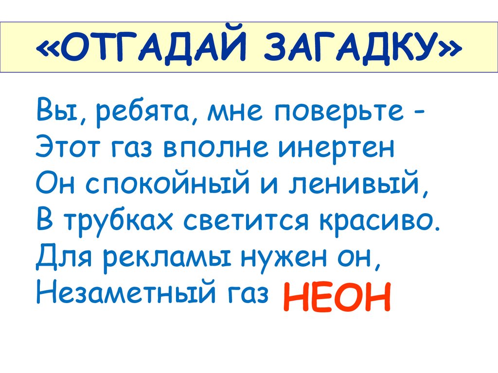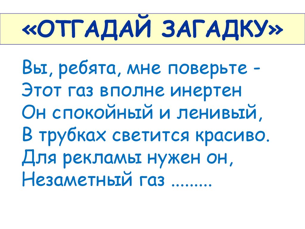 «ОТГАДАЙ ЗАГАДКУ»Вы, ребята, мне поверьте Этот газ вполне инертен
