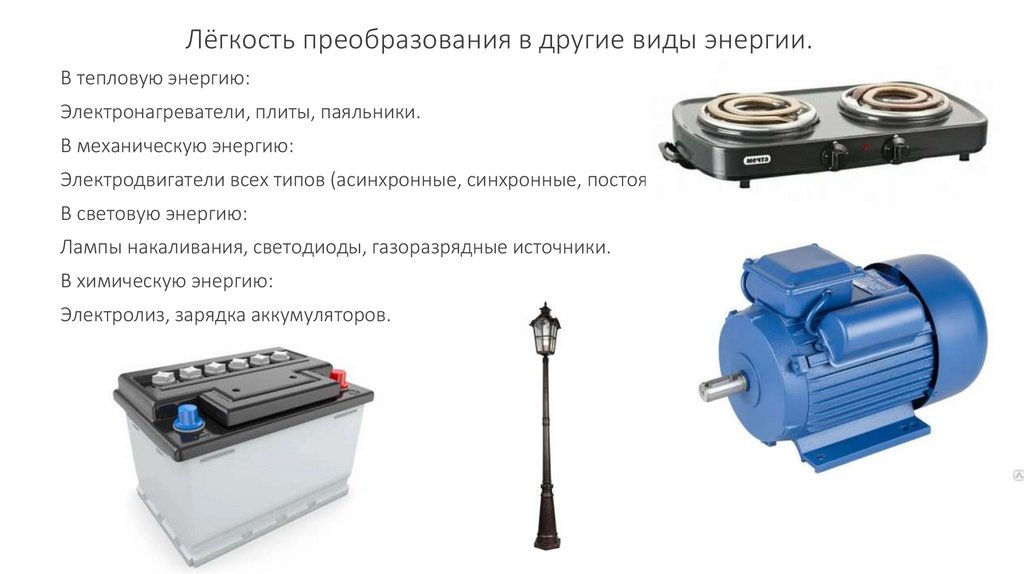 Лёгкость преобразования в другие виды энергии.В тепловую энергию: