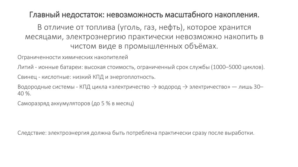 Главный недостаток: невозможность масштабного накопления.В отличие от топлива (уголь, газ, нефть), которое хранится