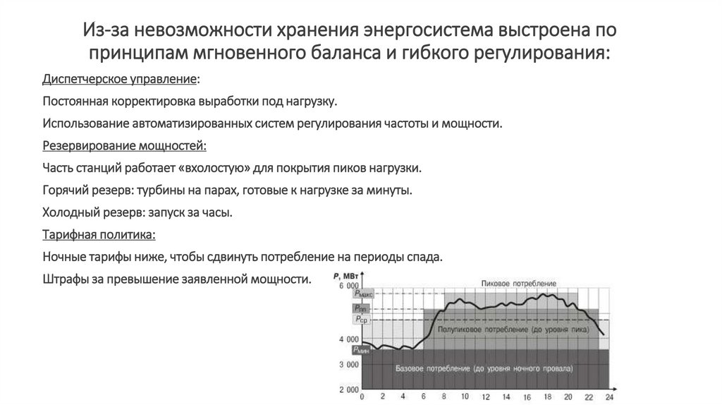 Из-за невозможности хранения энергосистема выстроена попринципам мгновенного баланса и гибкого регулирования: