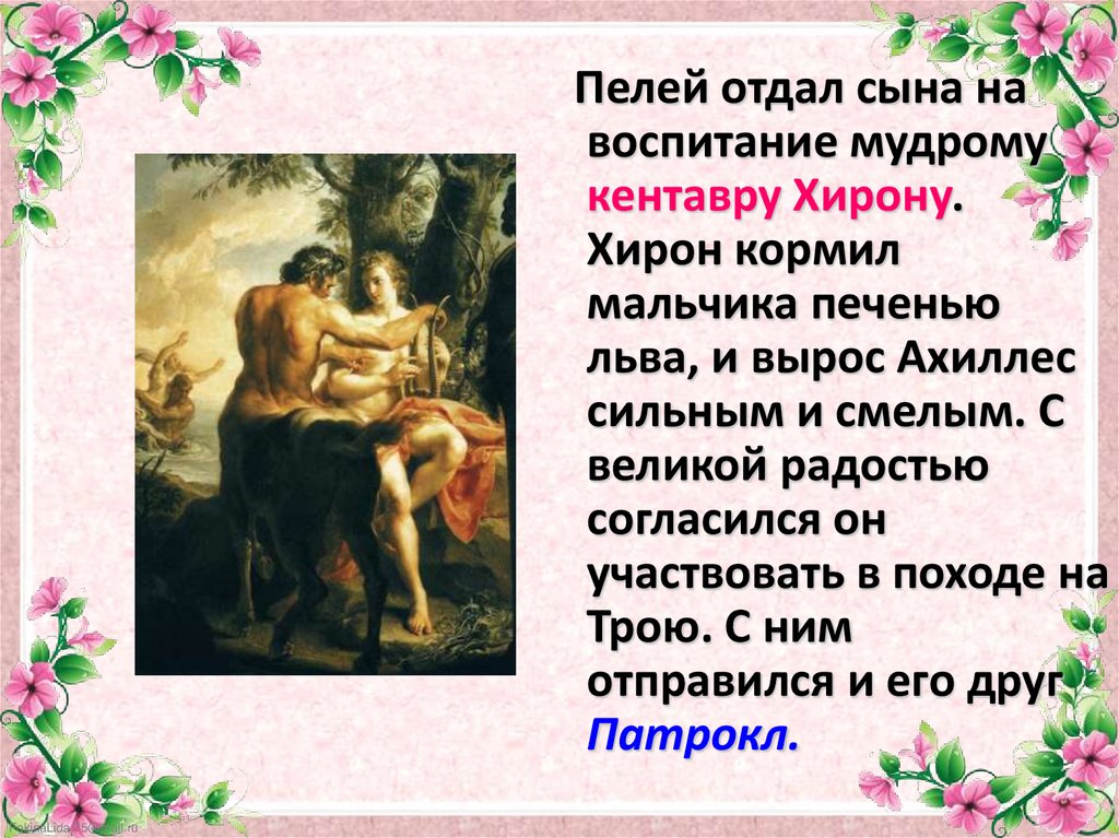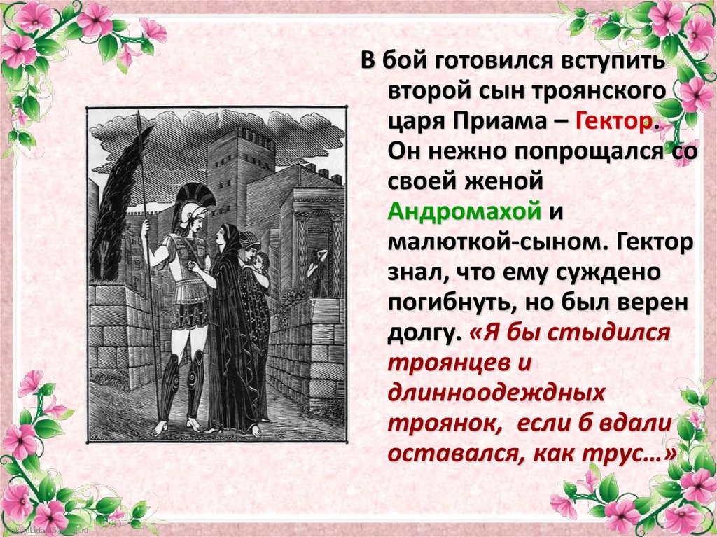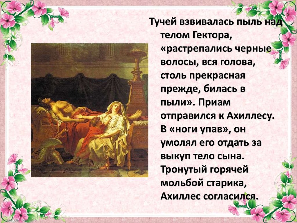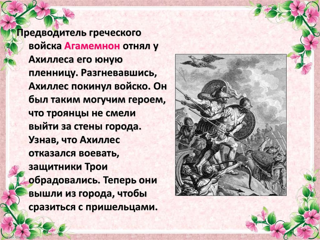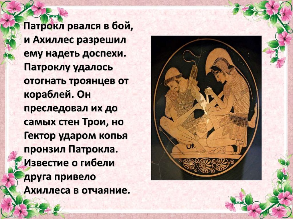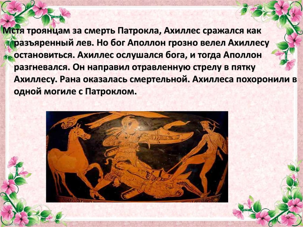 Мстя троянцам за смерть Патрокла, Ахиллес сражался какразъяренный лев. Но бог Аполлон грозно велел Ахиллесу