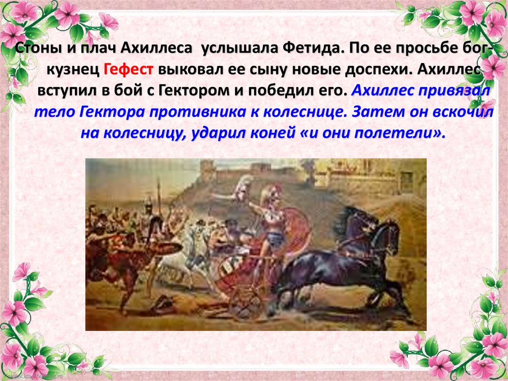 Стоны и плач Ахиллеса услышала Фетида. По ее просьбе богкузнец Гефест выковал ее сыну новые доспехи. Ахиллесвступил в бой с Гектором и победил его. Ахиллес привязал
