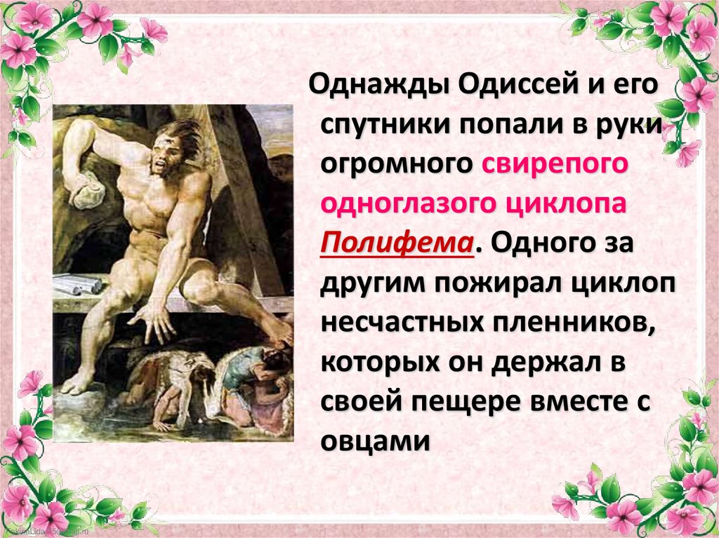 заостренного бревна и выжгли им глаз циклопа. Утром Полифем
