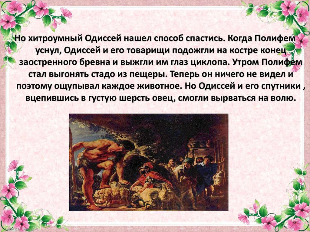 Но хитроумный Одиссей нашел способ спастись. Когда Полифемуснул, Одиссей и его товарищи подожгли на костре конец