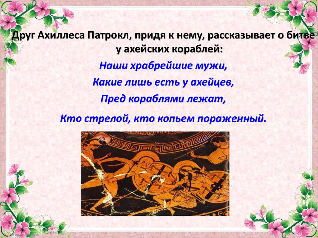 Друг Ахиллеса Патрокл, придя к нему, рассказывает о битвеу ахейских кораблей: