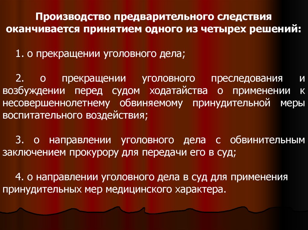Производство предварительного следствияоканчивается принятием одного из четырех решений: