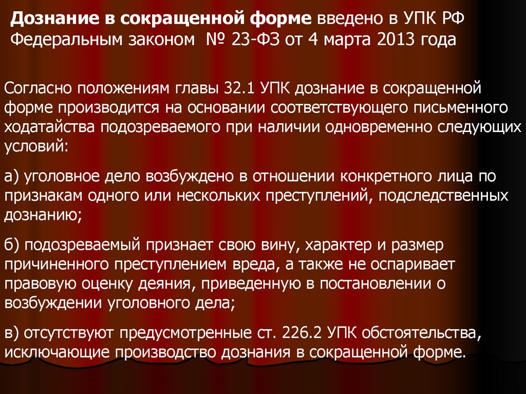 Дознание в сокращенной форме введено в УПК РФФедеральным законом № 23-ФЗ от 4 марта 2013 года