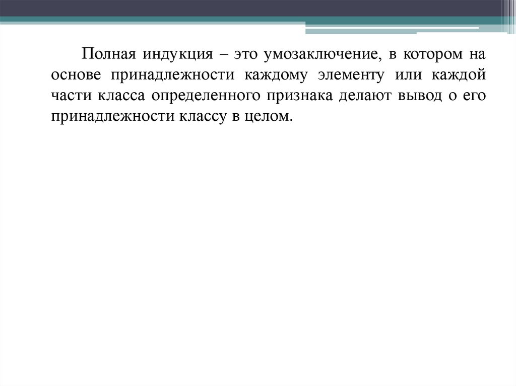 Полная индукция – это умозаключение, в котором наоснове принадлежности каждому элементу или каждой