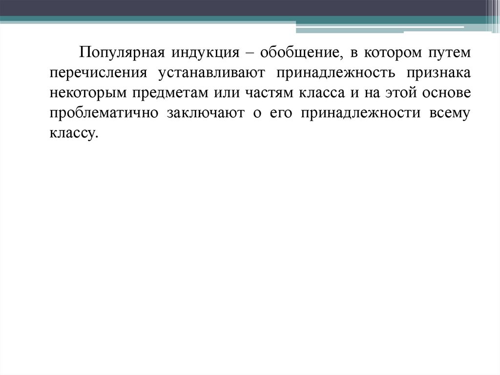 Популярная индукция – обобщение, в котором путемперечисления устанавливают принадлежность признака
