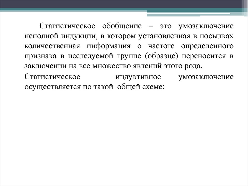 Статистическое обобщение – это умозаключениенеполной индукции, в котором установленная в посылках