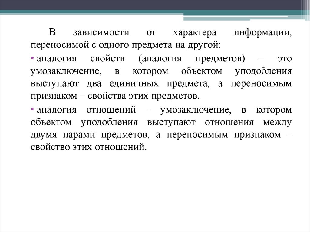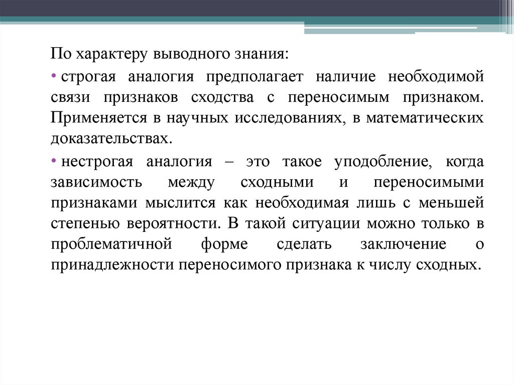 По характеру выводного знания:• строгая аналогия предполагает наличие необходимой