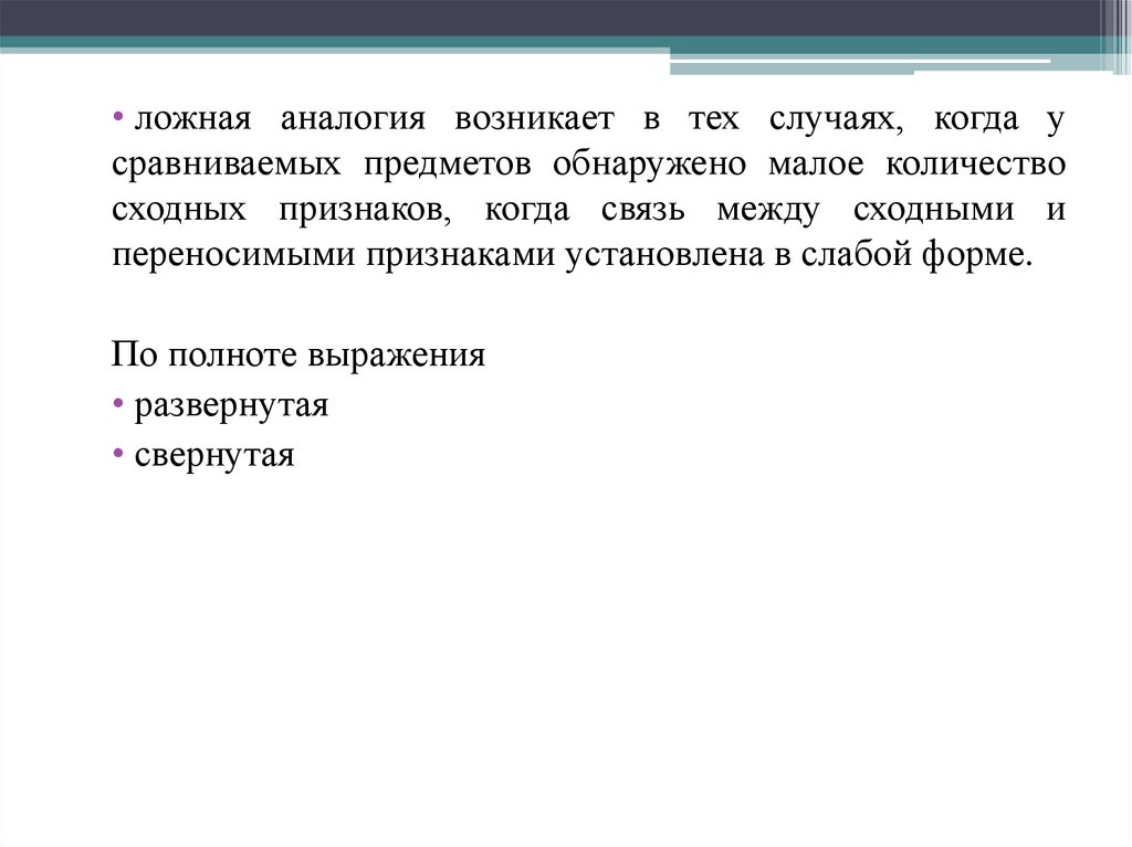 • ложная аналогия возникает в тех случаях, когда усравниваемых предметов обнаружено малое количество