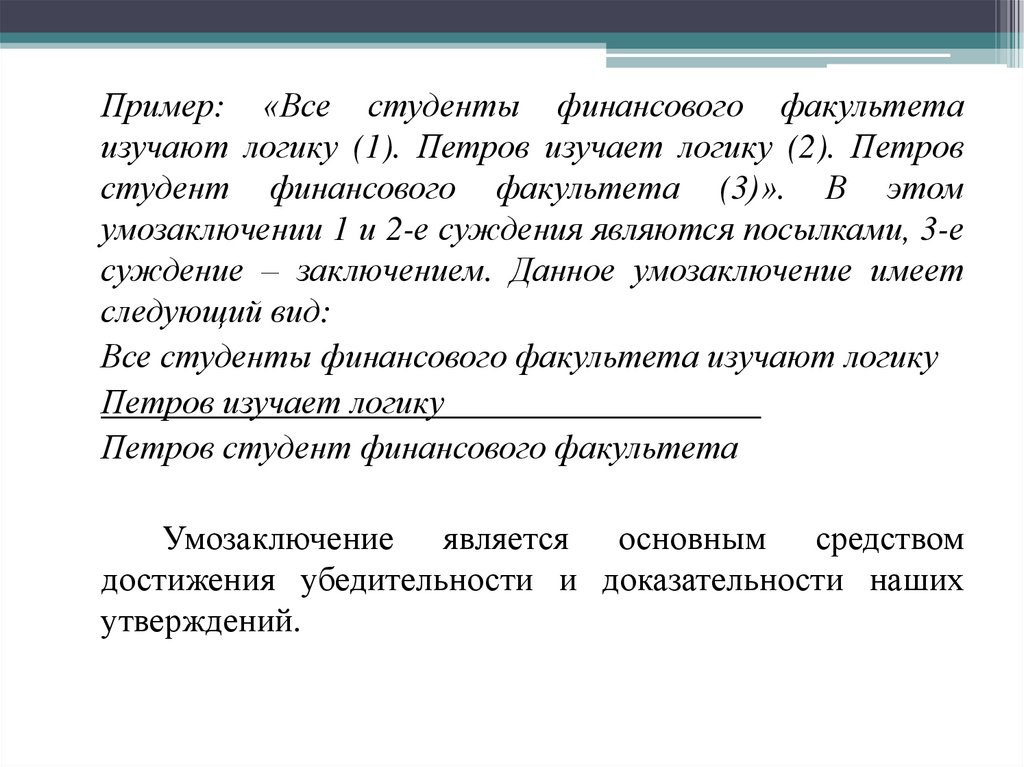 Пример: «Все студенты финансового факультетаизучают логику (1). Петров изучает логику (2). Петров