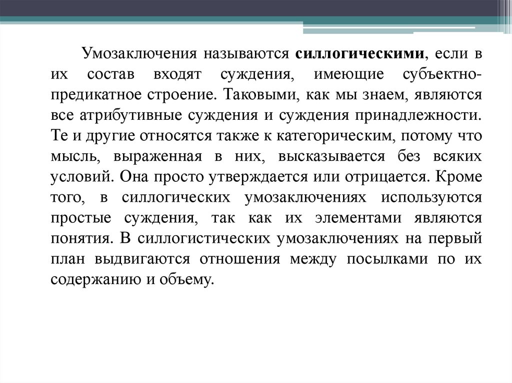 Умозаключения называются силлогическими, если вих состав входят суждения, имеющие субъектнопредикатное строение. Таковыми, как мы знаем, являются