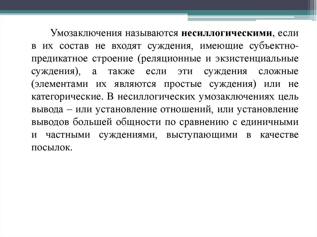 Умозаключения называются несиллогическими, еслив их состав не входят суждения, имеющие субъектнопредикатное строение (реляционные и экзистенциальные