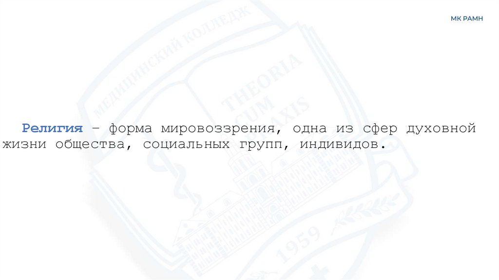 Религия – форма мировоззрения, одна из сфер духовнойжизни общества, социальных групп, индивидов.