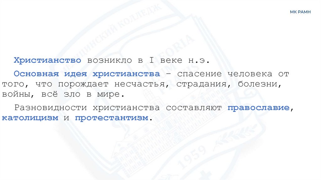 Христианство возникло в I веке н.э.Основная идея христианства – спасение человека от