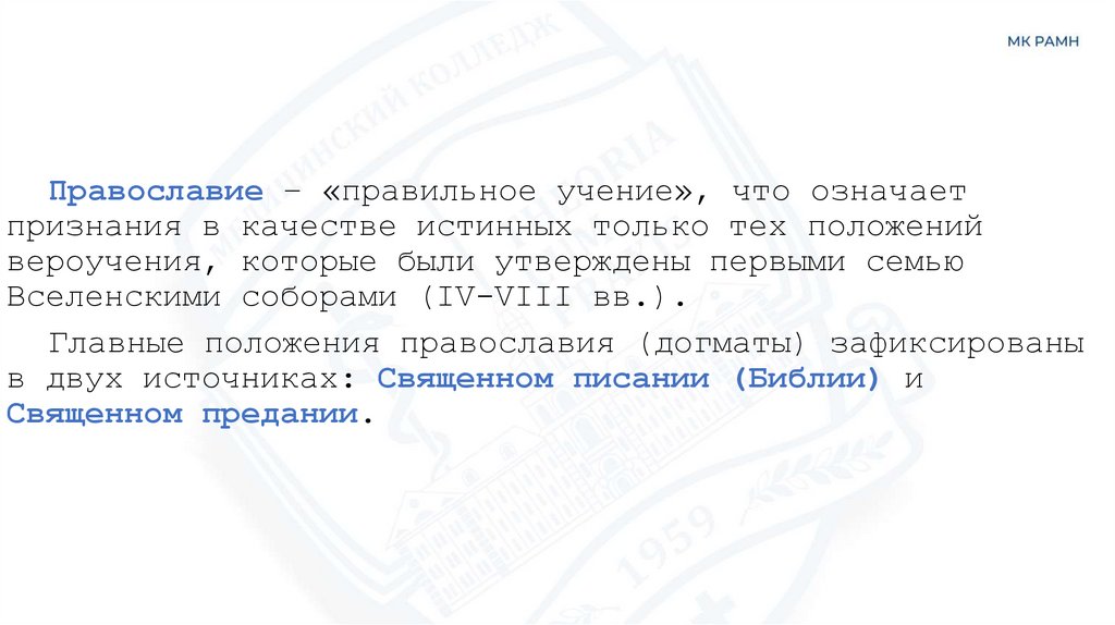 Православие – «правильное учение», что означаетпризнания в качестве истинных только тех положений
