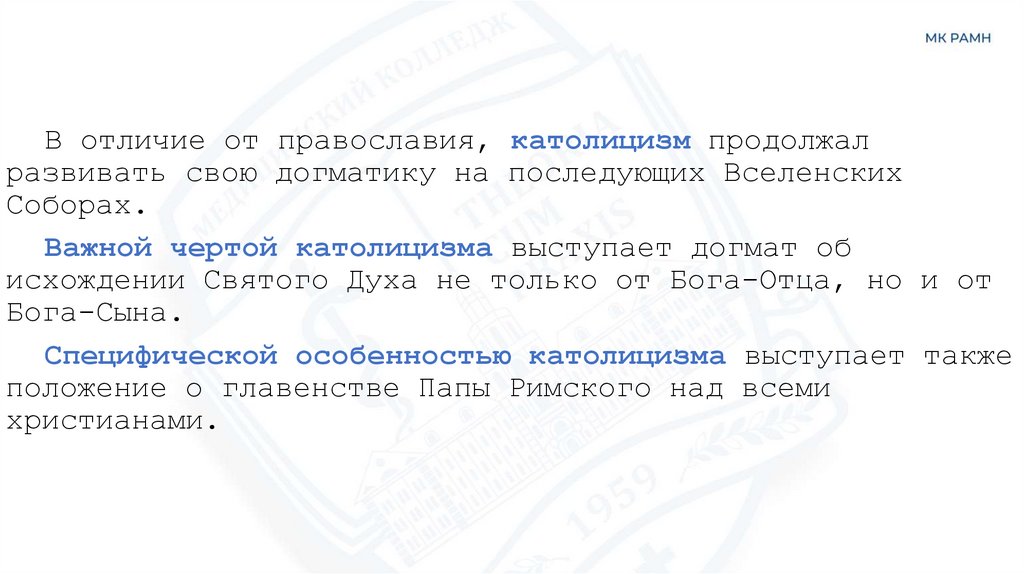 В отличие от православия, католицизм продолжалразвивать свою догматику на последующих Вселенских