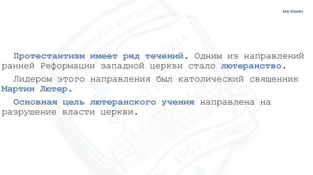 Протестантизм имеет ряд течений. Одним из направленийранней Реформации западной церкви стало лютеранство.
