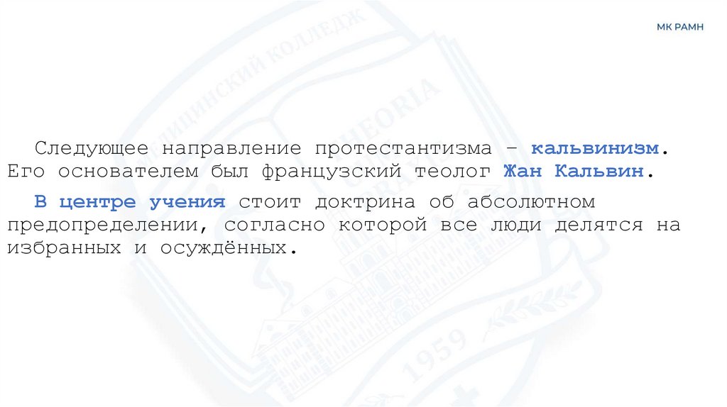 Следующее направление протестантизма – кальвинизм.Его основателем был французский теолог Жан Кальвин.