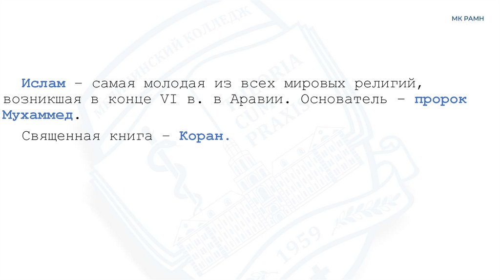 Ислам – самая молодая из всех мировых религий,возникшая в конце VI в. в Аравии. Основатель – пророк