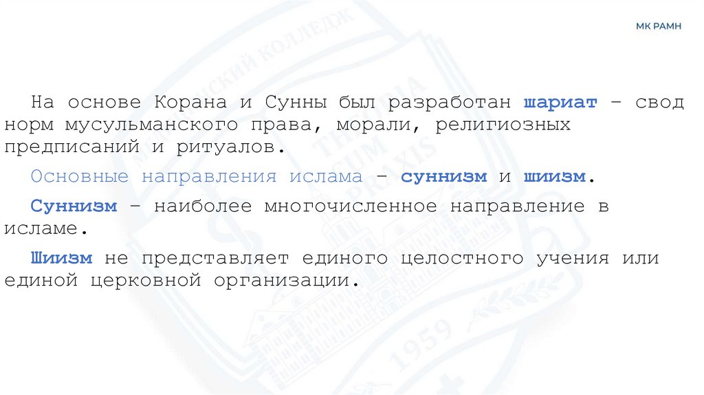 На основе Корана и Сунны был разработан шариат – своднорм мусульманского права, морали, религиозных
