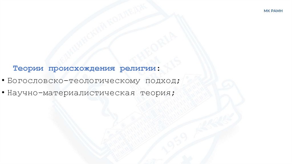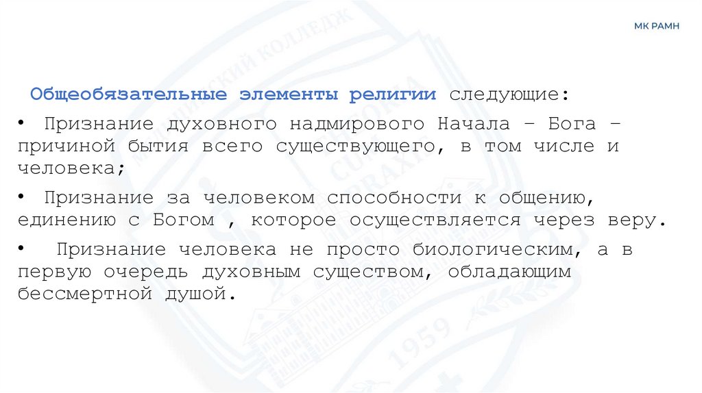 Общеобязательные элементы религии следующие:• Признание духовного надмирового Начала – Бога –