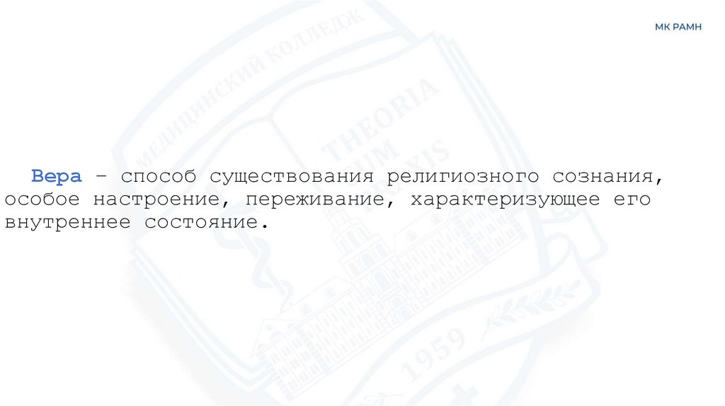 Вера – способ существования религиозного сознания,особое настроение, переживание, характеризующее его