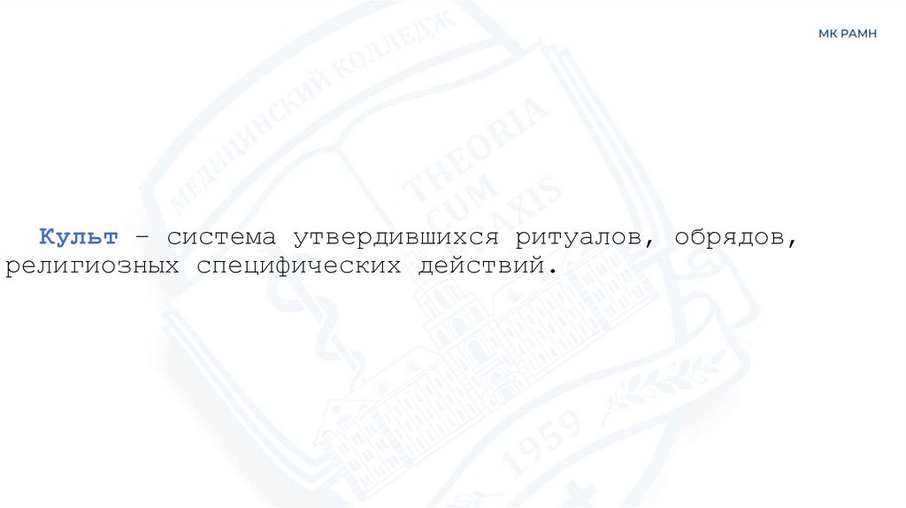 Культ – система утвердившихся ритуалов, обрядов,религиозных специфических действий.